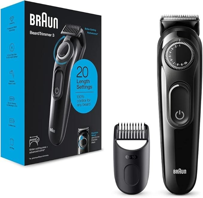 Braun Beard Trimmer 3 BT3300. حداقل طول مو: 0.5 میلی متر، حداکثر طول مو: 1 سانتی متر. رنگ محصول: مشکی، کشور مبدا: چین. منبع تغذیه: AC/باتری، زمان کارکرد: 50 دقیقه، نوع باتری: باتری داخلی. وزن: 211 گرم، وزن باتری: 13 گرم. عرض بسته بندی: 56 میلی متر، عمق بسته: 125.5 میلی متر، ارتفاع بسته: 220 میلی متر