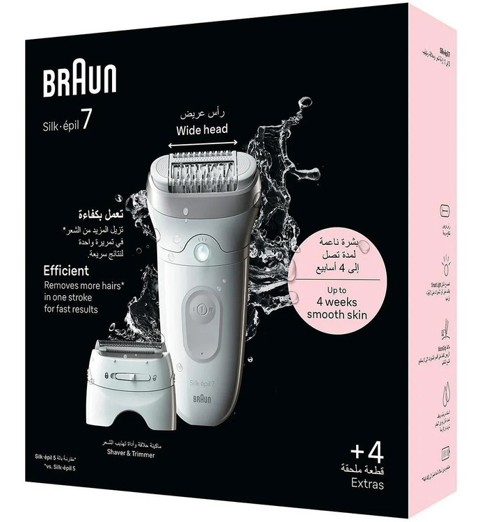 دستگاه اصلاح موی Braun Silk-épil 7 یک دستگاه سه کاره همه کاره است که اپیلاسیون، اصلاح و آرایش دقیق را با هم ترکیب میکند. این دستگاه با داشتن سری پهن و 40 موچین MicroGrip، موهای بیشتری را در یک حرکت از بین میبرد، حتی موهایی به کوتاهی 0.5 میلیمتر. این دستگاه تا 1 ماه پوستی صاف را ارائه میدهد و شامل یک کلاه غلتکی ماساژ برای اطمینان از یک تجربه راحت است. چراغ هوشمند به شما کمک میکند حتی ریزترین موها را ببینید، در حالی که طراحی بیسیم آن 40 دقیقه استفاده بدون وقفه را ارائه میدهد. همچنین شامل یک ریشتراش زنانه و یک شانه اصلاح برای نواحی حساس است.